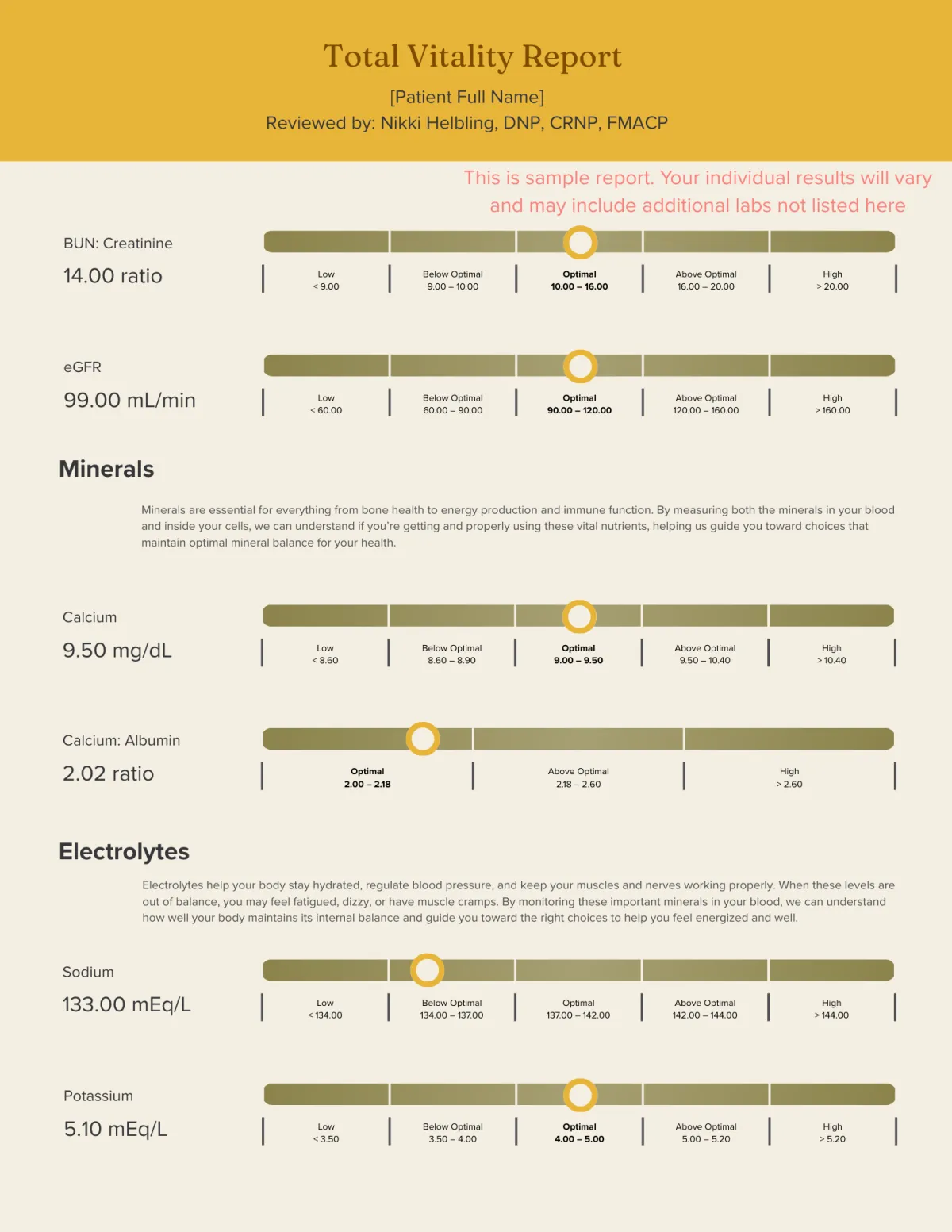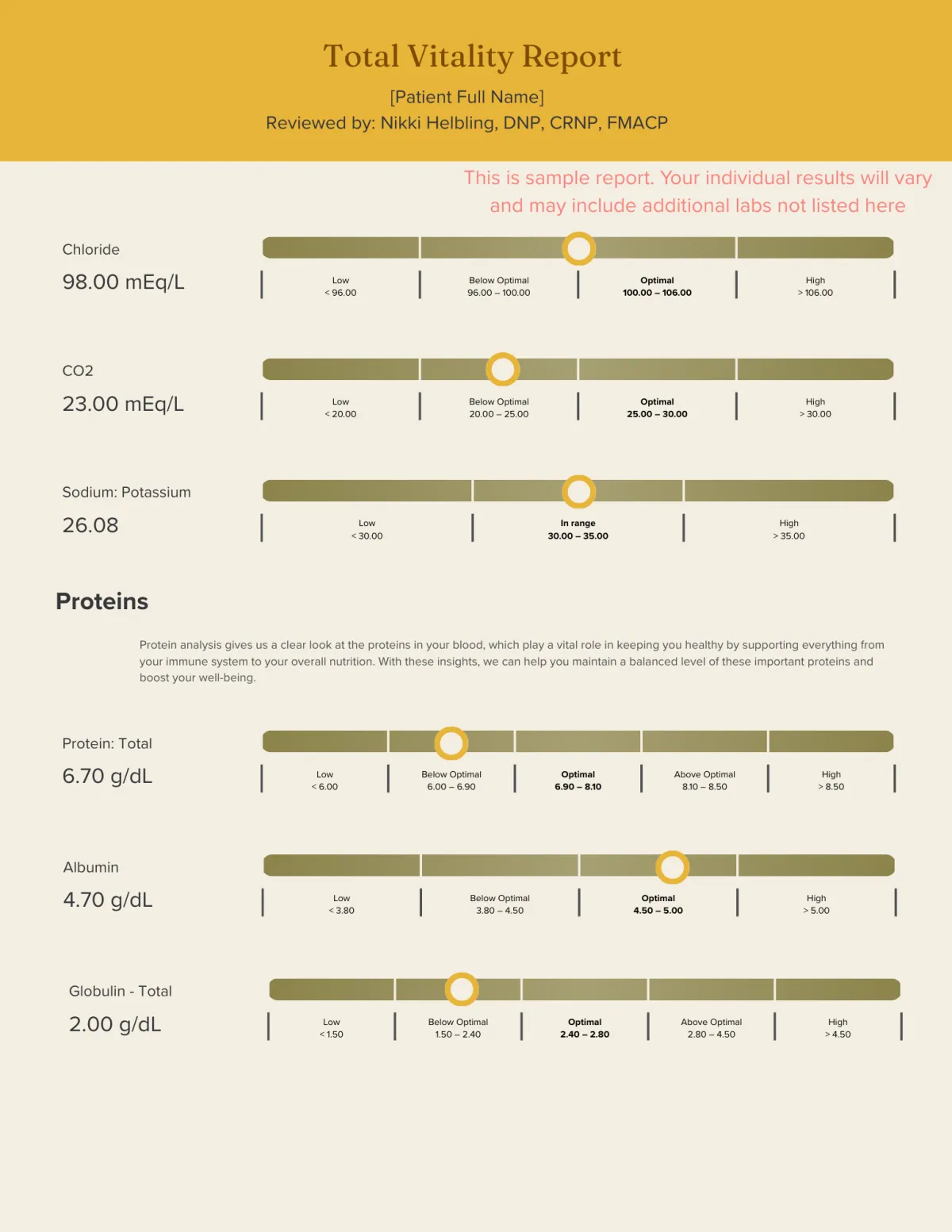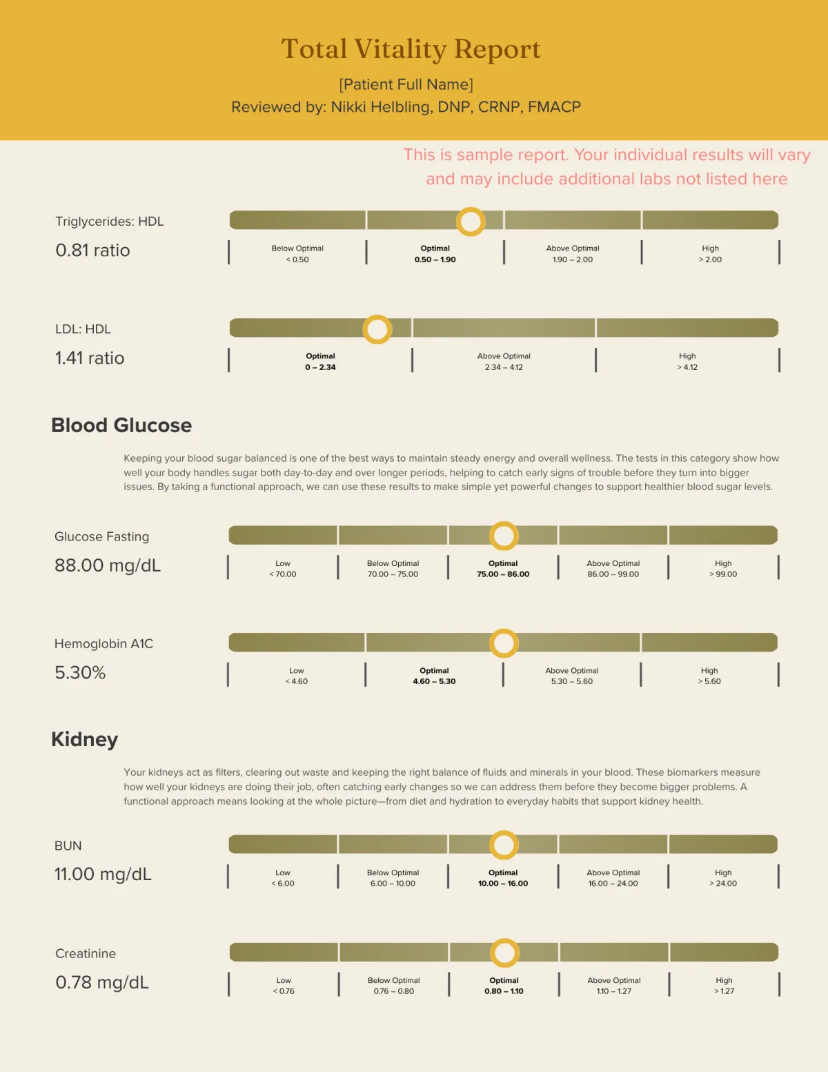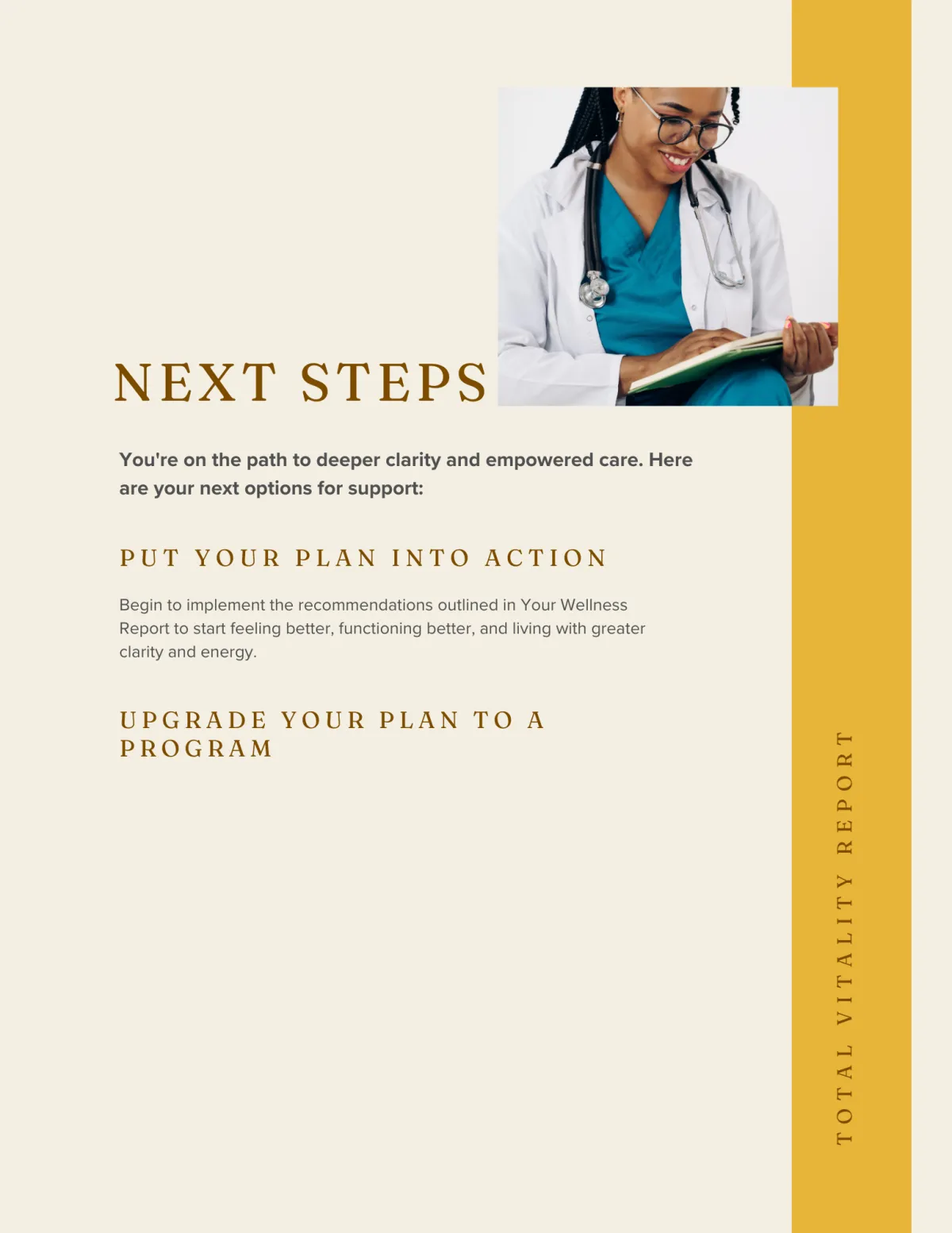 From there, you’ll receive your Total Vitality Profile — a personalized roadmap, not a cookie-cutter plan. This is your foundation: precision-based insights that outline what your body needs and the smartest next steps to take. While it won’t be your entire long-term plan, it gives you the clarity and direction to move forward with confidence—and sets the stage for deeper work together if you choose.