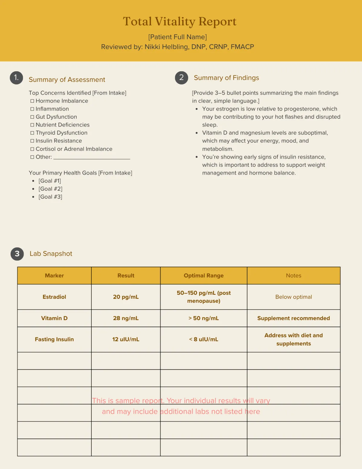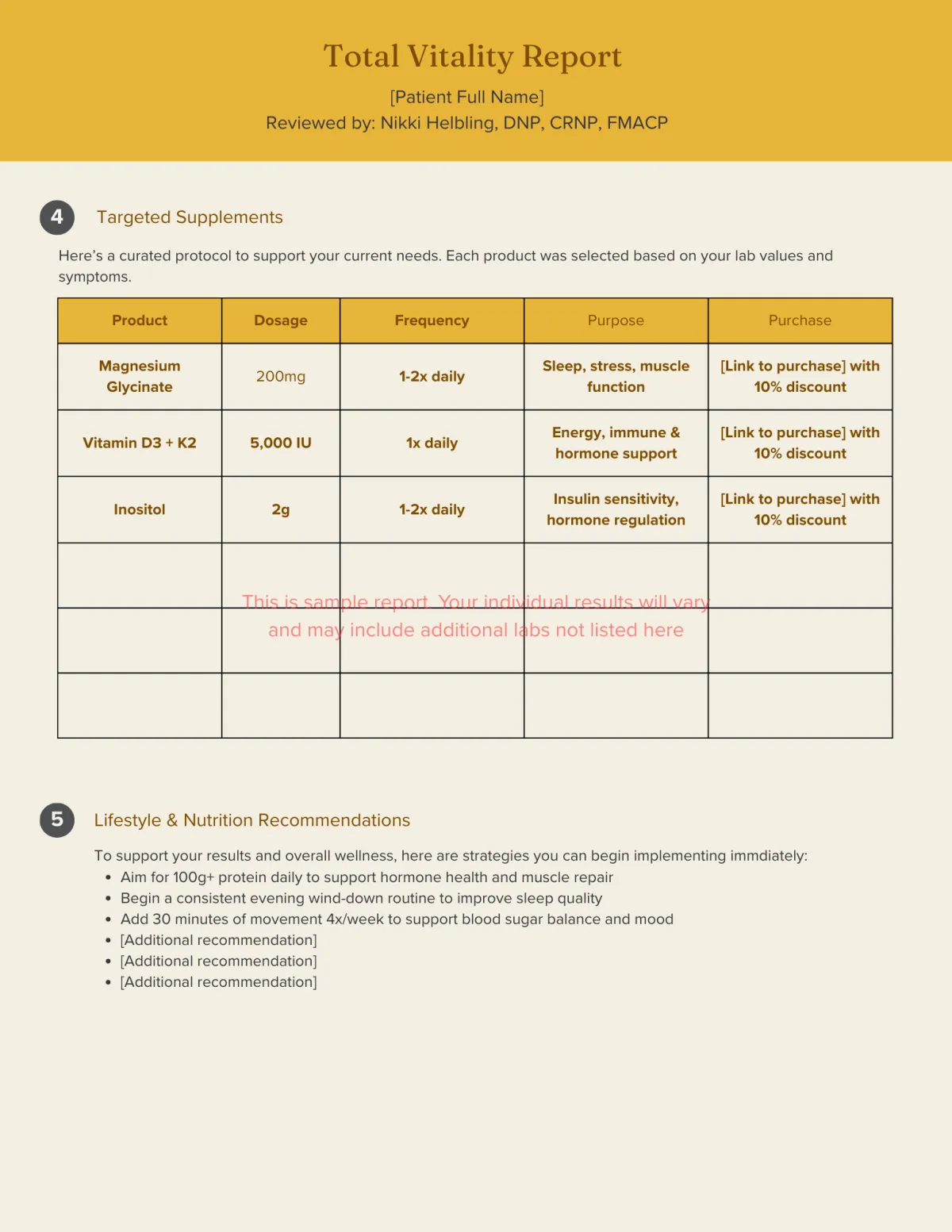 This is your personalized, precision-based roadmap that integrates lab values, nutrition strategies, targeted supplements, lifestyle guidance, and stress resilience practices. Tailored—not templated—to your unique body.